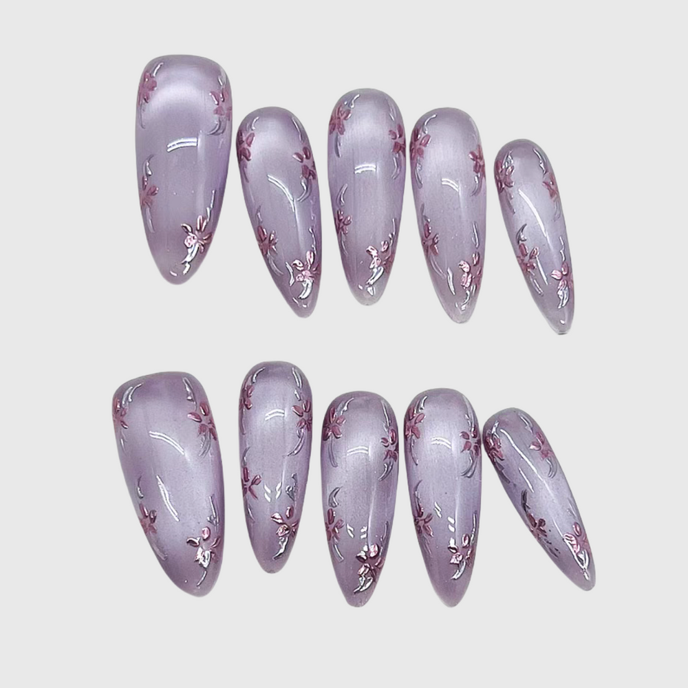 Light purple sheer bases bloom with bauhinia🌸, silver lines outline delicate flowers. Hazy and elegant—embroidering the softness and poetry of bauhinia blossoms right onto fingertips~