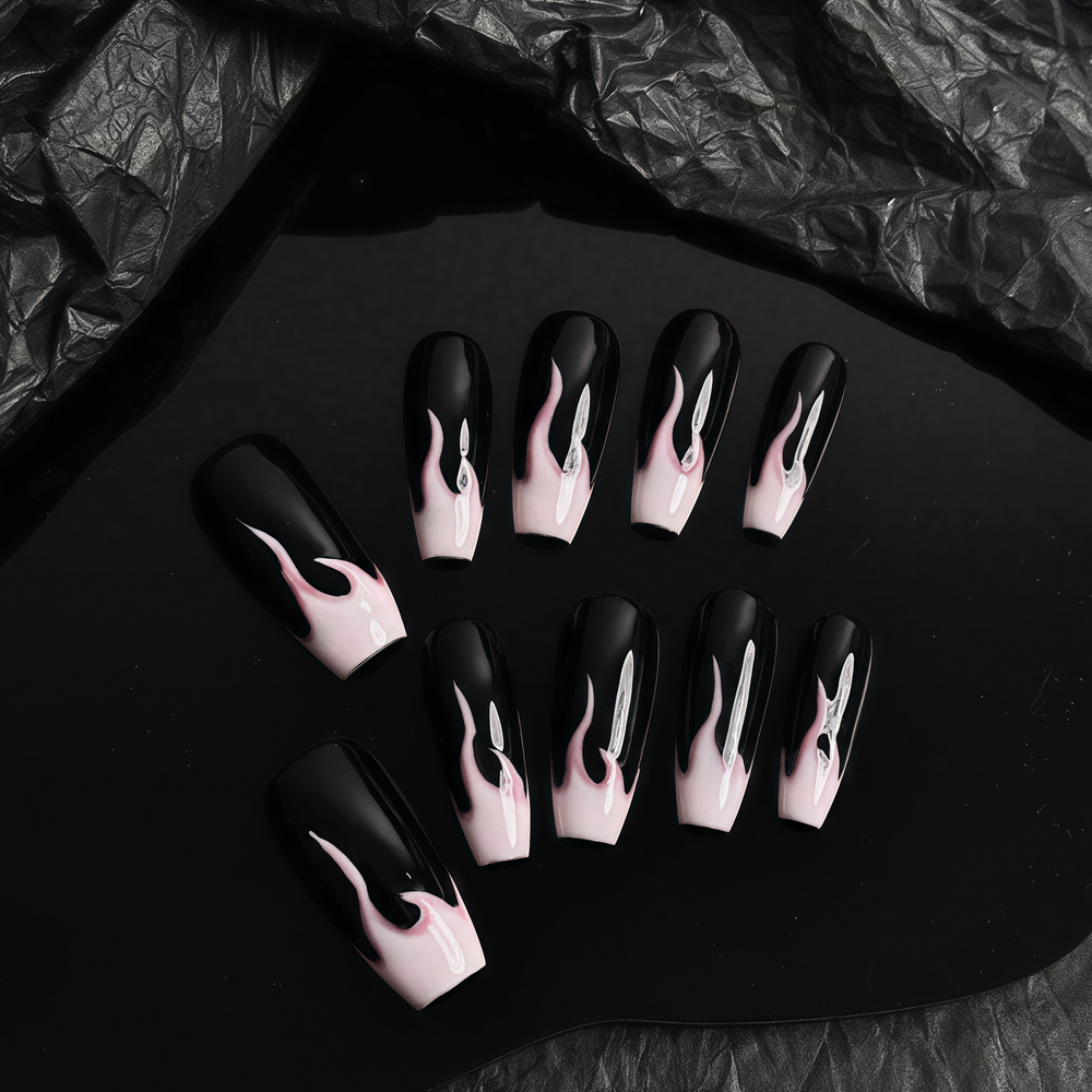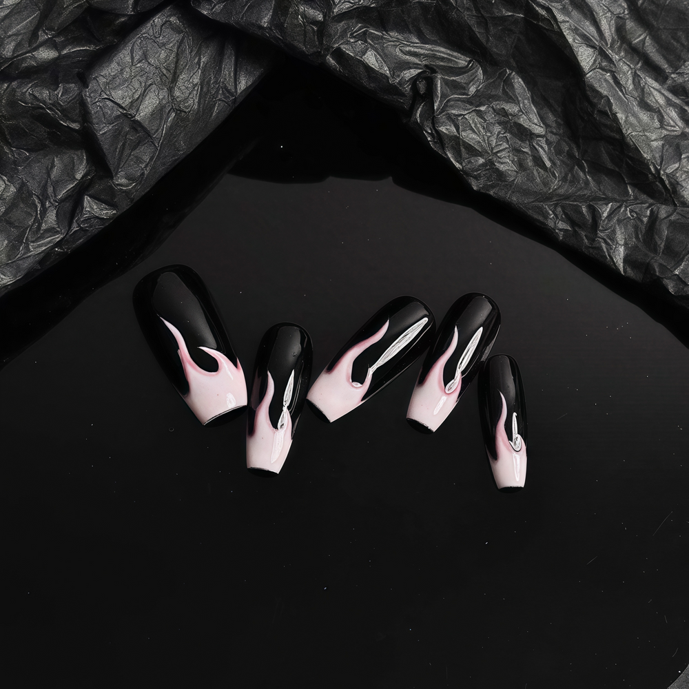 Black powder flame nails are a captivating blend of edginess and artistry. The nails have a sleek black base that sets a bold tone, while delicate, swirling patterns of soft pink mimic the look of flickering flames. The contrast between the deep black and the gentle pink creates a striking visual effect, as if the flames are dancing on the nails. This design combines a touch of danger and allure, making it perfect for those who want to make a bold fashion statement. Whether for a night out or a special event, these nails are sure to turn heads with their unique and dynamic appearance.
