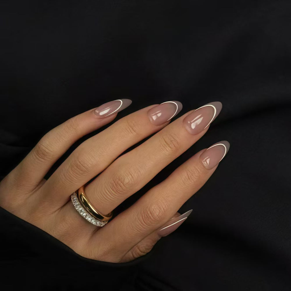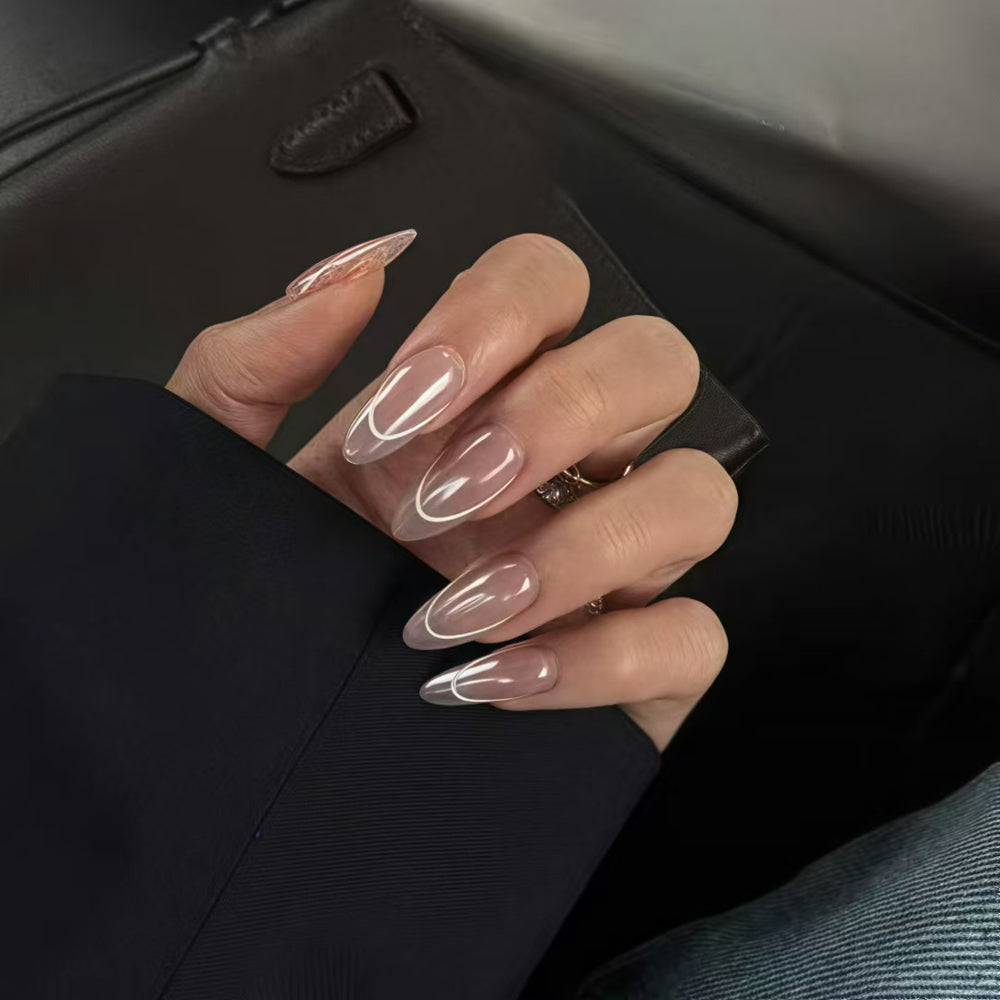 Classic arc single line nails offer a minimalist yet striking aesthetic. The nails, shaped into elegant stiletto forms, feature a sheer, nude - toned base that exudes natural sophistication. A single, sleek white arc line gracefully curves across each nail, adding a touch of geometric contrast and modern charm. With its glossy finish, the manicure catches the light beautifully, highlighting the clean lines and understated elegance. This design is perfect for those who appreciate a timeless look with a contemporary twist.