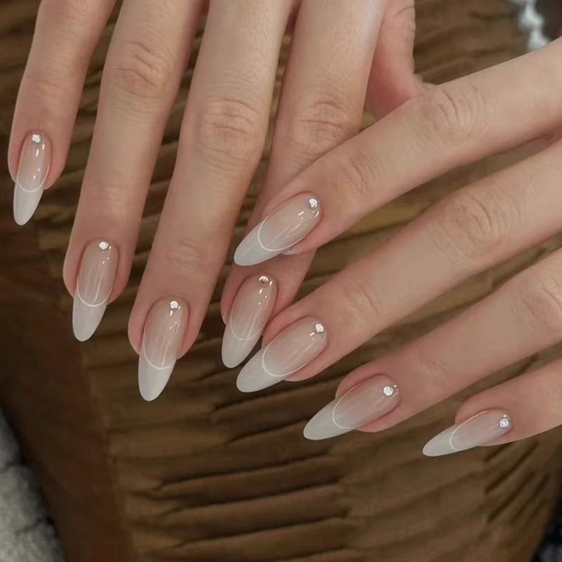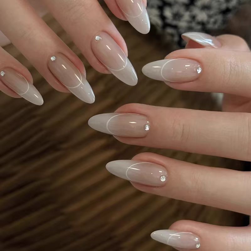 Diamond Dust nails blend a soft, muted base with delicate white line detailing. Tiny, diamond - like gems add a glistening touch, creating a refined yet glamorous manicure that balances subtlety and sparkle.