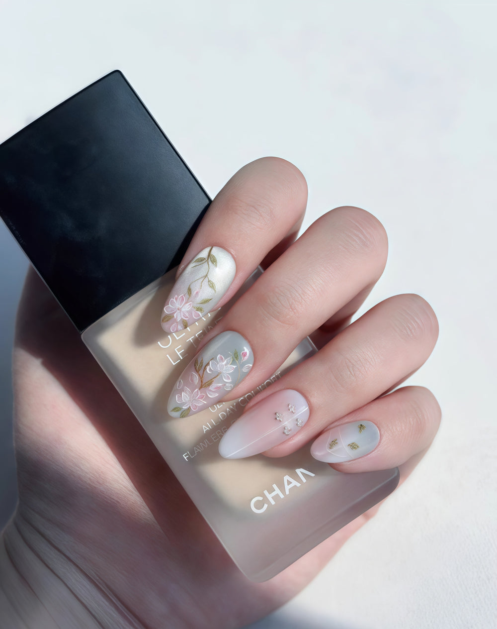 Galaxy Begonia nails are a dreamy fusion of soft pinks and celestial silver. The muted, blush - toned base sets a gentle stage, while the silver - hued nails act as a galaxy - like backdrop. Delicate pink begonia flowers with green foliage are painted on, as if blooming under a starry sky. Small silver studs add a touch of cosmic sparkle. It's a romantic, whimsical design that blends floral charm with celestial allure.