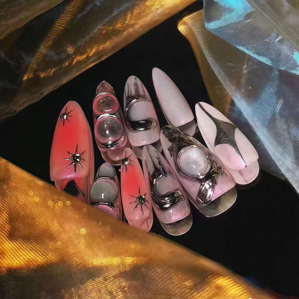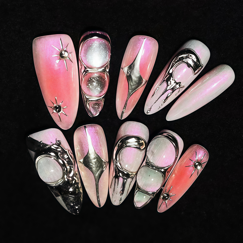 Leopard dragon fruit nails are a vibrant and imaginative creation. The nails showcase a gradient of soft pinks, reminiscent of the inside of a dragon fruit. Metallic silver accents add a modern, edgy touch, forming shapes that evoke both the sleek lines of a dragon and the spots of a leopard. Small, sparkling studs resemble stars, enhancing the overall celestial and wild feel. This unique combination of sweet, fruity hues and fierce, animal - inspired elements makes for a manicure that's both playful and bold, perfect for those who love to express their individuality through their nails.