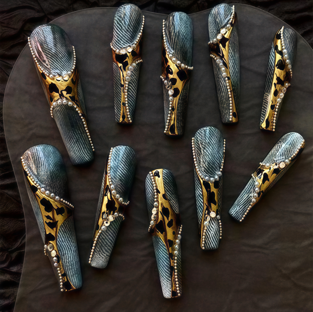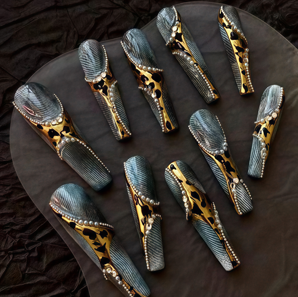 Leopard print denim nails are a trendy and eye - catching fusion of two iconic styles. The nails feature a denim - inspired base, mimicking the texture and color of blue denim fabric. Interspersed with the denim look are bold leopard print patches in gold and black, adding a wild and glamorous touch. Tiny rhinestones and beads are strategically placed along the edges, enhancing the overall sparkle and luxury. This design combines the casual cool of denim with the fierce allure of leopard print, making it a perfect choice for fashion - forward individuals who want to stand out with a unique and stylish manicure.