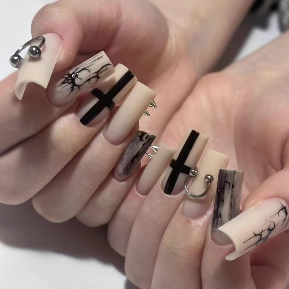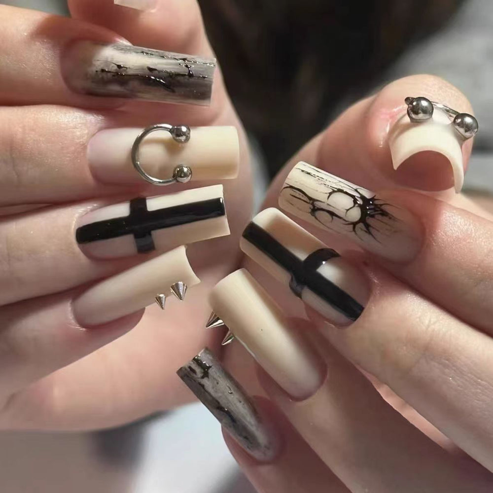 Rivet ink painting nails offer a striking blend of edgy and artistic elements. The nails, in an elongated shape, showcase a base of soft, neutral tones, creating a canvas that's both subtle and sophisticated. Bold black cross - like patterns and crackling ink - style designs add a sense of drama and intrigue, reminiscent of abstract art. Metallic rivets and studs are strategically placed, introducing an industrial, punk - inspired touch. This unique combination makes for a manicure that stands out, perfect for those who want to express a rebellious yet creative side through their nail art.