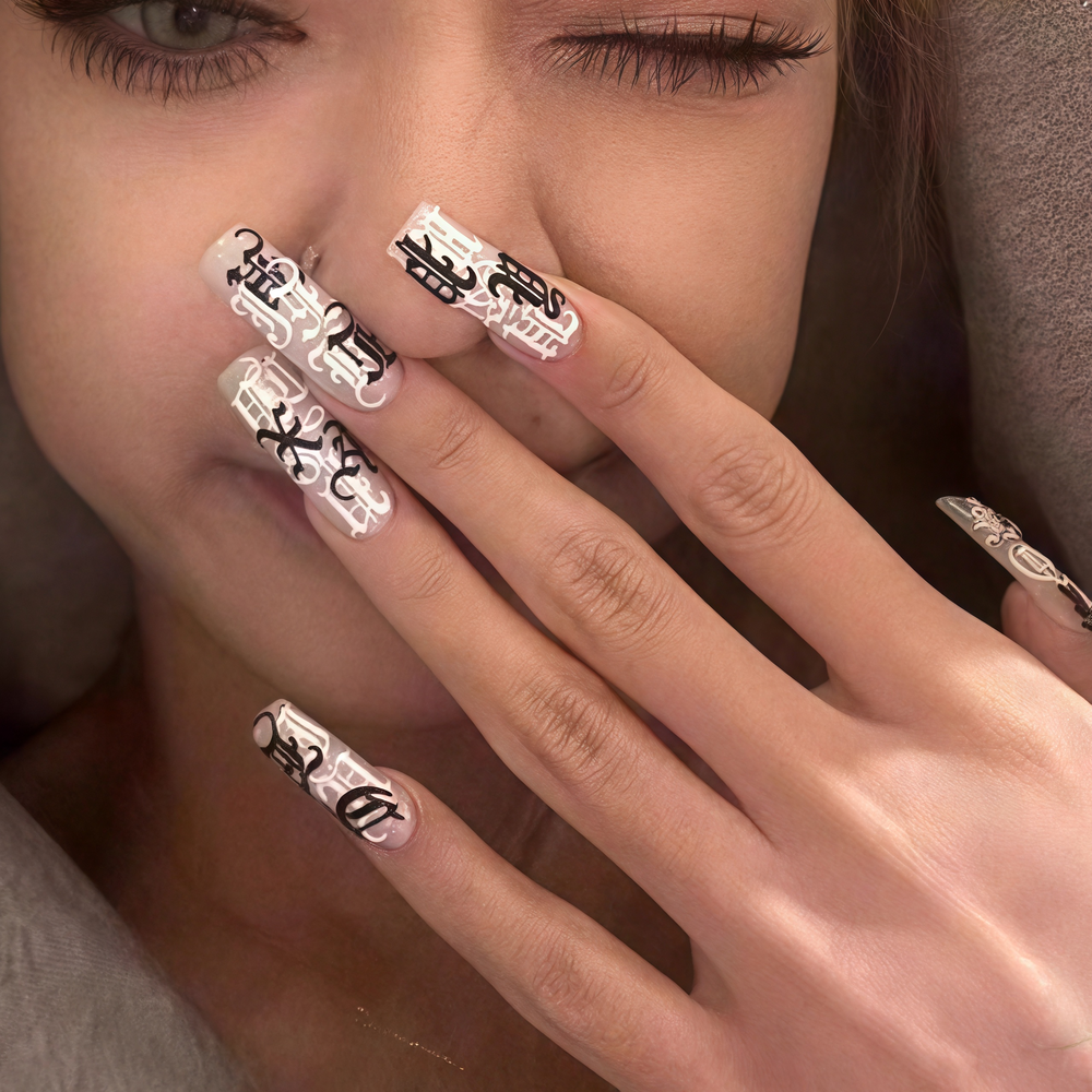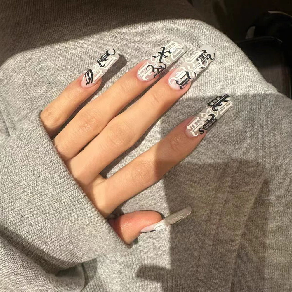 The Square gothic black and white symbol nails exude an air of mysterious elegance. Shaped into sleek square - edged forms, these nails feature a sheer base that serves as a canvas for striking black gothic - style symbols and patterns. Interspersed with delicate white lace - like designs, they create a captivating contrast. The combination of the sharp, geometric nail shape with the intricate, dark symbols and the soft, light lace details results in a manicure that's both edgy and sophisticated, perfect for those who want to showcase a unique, alternative style.
