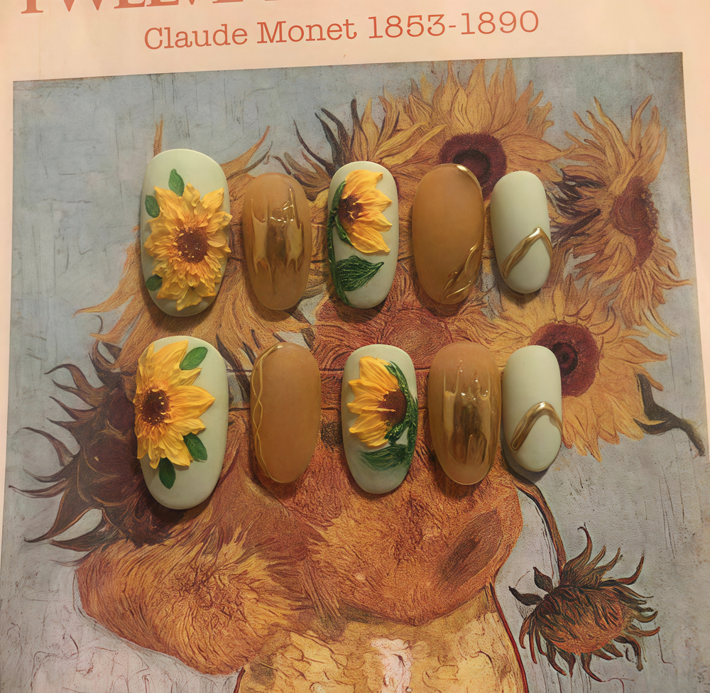 The sunflower - themed nails are a vibrant celebration of nature's beauty. Soft, pastel - colored bases, like light blue and warm brown, create a gentle backdrop that makes the sunflower designs pop. Some nails feature three - dimensional sunflowers with bright yellow petals and dark centers, giving a realistic and eye - catching effect. Gold - toned accents, shaped like delicate swirls or lines, add a touch of elegance and a bit of shimmer, enhancing the overall charm. These nails are perfect for those who want to carry a piece of sunny, floral cheer on their fingertips, combining a sense of whimsy and sophistication.