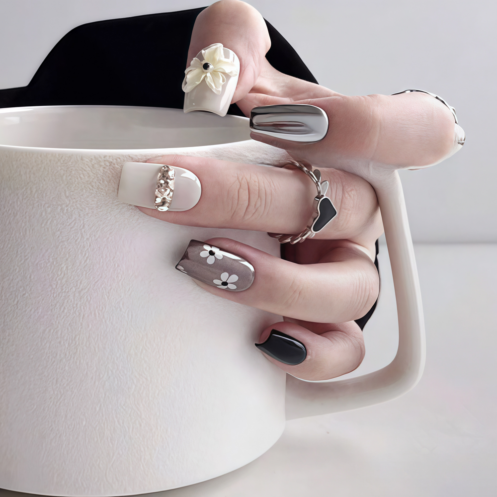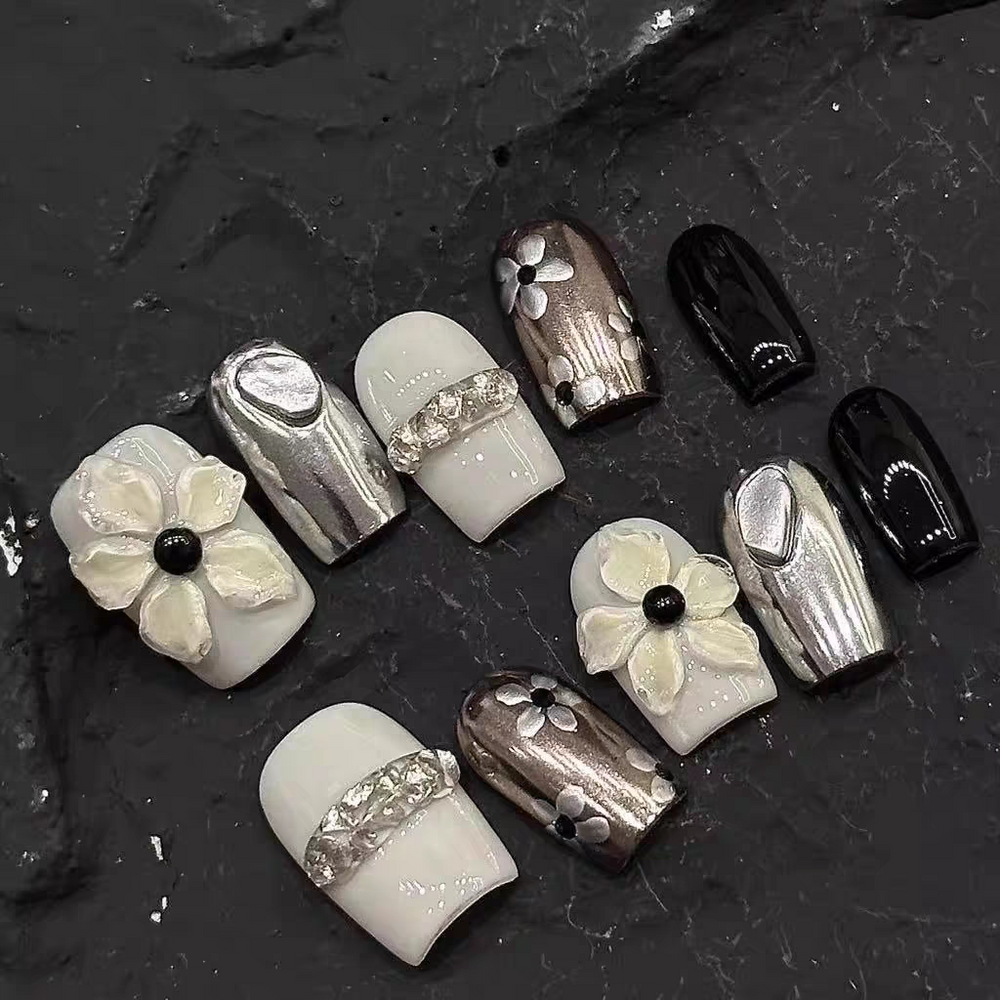 Three - dimensional black ice flower nails fuse sleek black bases with cool metallic gradients, adorned with raised, petal - like 3D blooms. Crystal accents and sharp silver details add icy - luxe edge, crafting a bold, futuristic floral manicure.