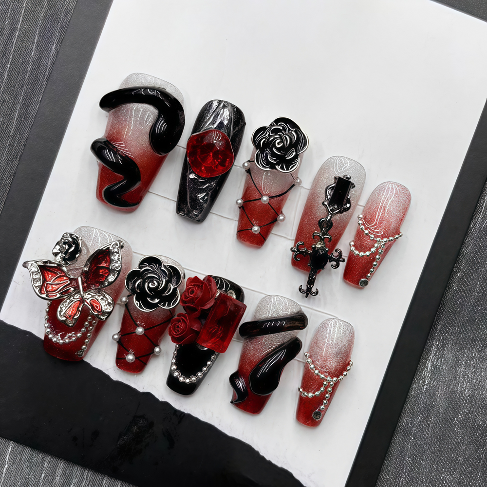 Gradient wine - red bases🍷, wrap black snakes and roses. Silver studs add gothic charm—twining night allure’s mystery and passion right onto fingertips~